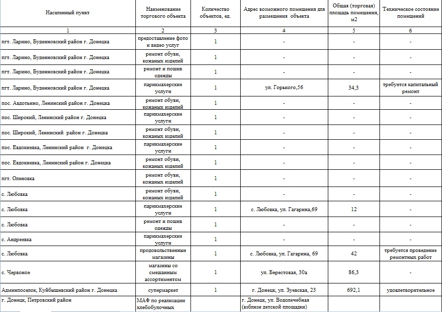 С целью развития потребительского рынка товаров и услуг, информируем о необходимости в дополнительном размещении объектов торговли, общественного питания и бытового обслуживания в районах г. Донецка, пгт. Ларино и на территориях поселковых и сельских администраций, временно включенных в зону влияния и ответственности г. Донецка.