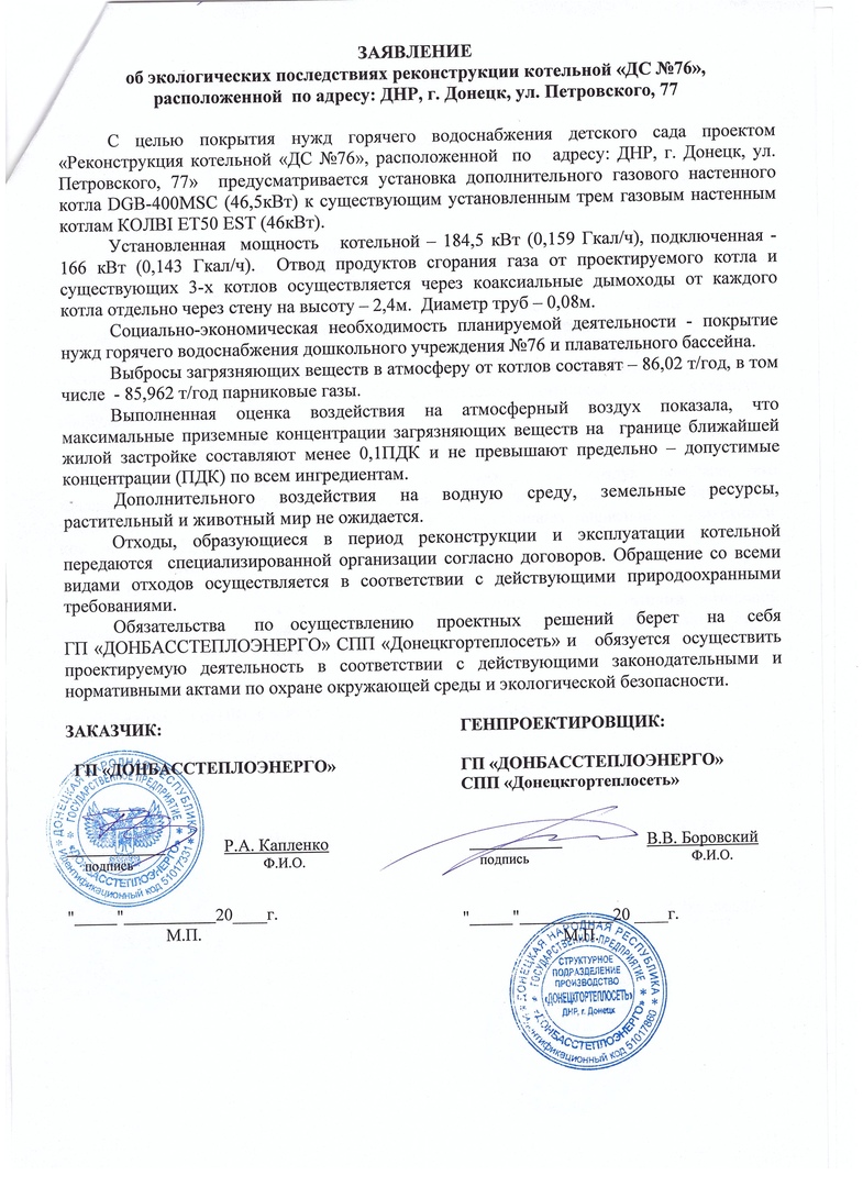 «Заявление об экологических последствиях реконструкции котельной «ДС № 76», расположенной по адресу: ДНР, г.Донецк, ул. Петровского, 77»