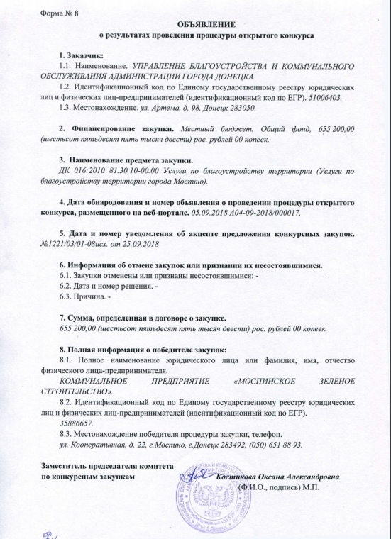 Объявление о результатах проведения процедуры открытого конкурса Управление благоустройства и коммунального обслуживания администрации г.Донецка Категория: Тендеры и закупки 28.09.2018 08:59