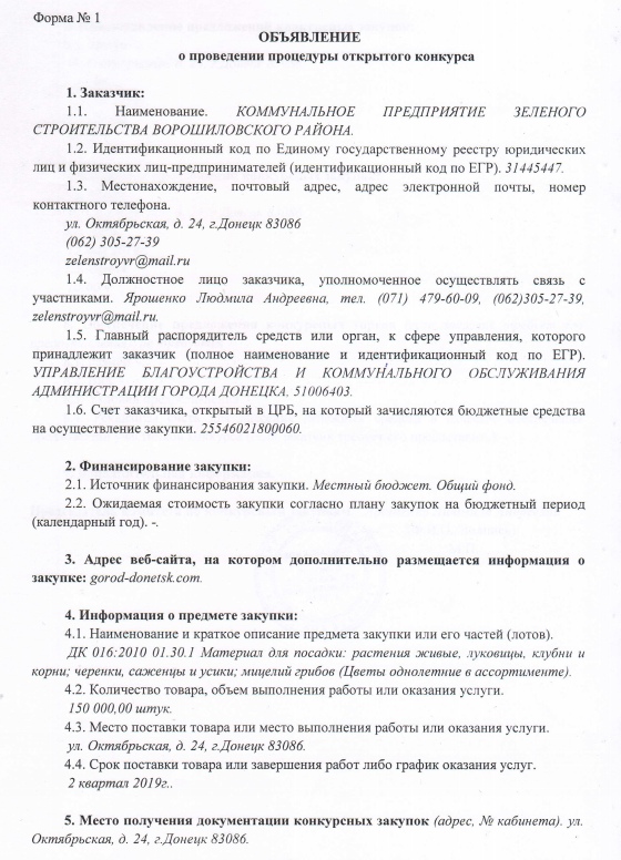 Объявление о проведении процедуры открытого конкурса КП Зеленого строительства Ворошиловского района Категория: Тендеры и закупки 24.04.2019 09:48