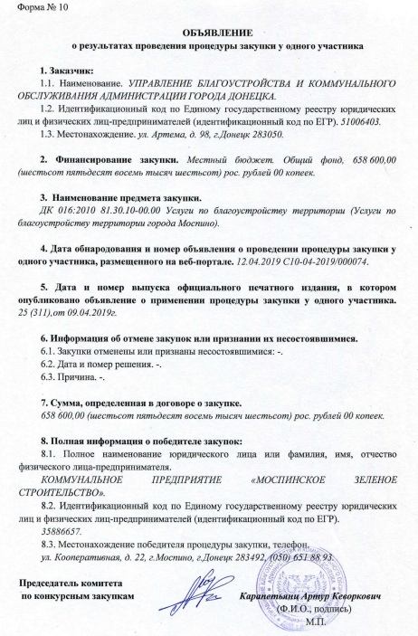 Объявление о результатах проведения процедуры закупки у одного участника Управление благоустройства и коммунального обслуживания администрации г.Донецка
