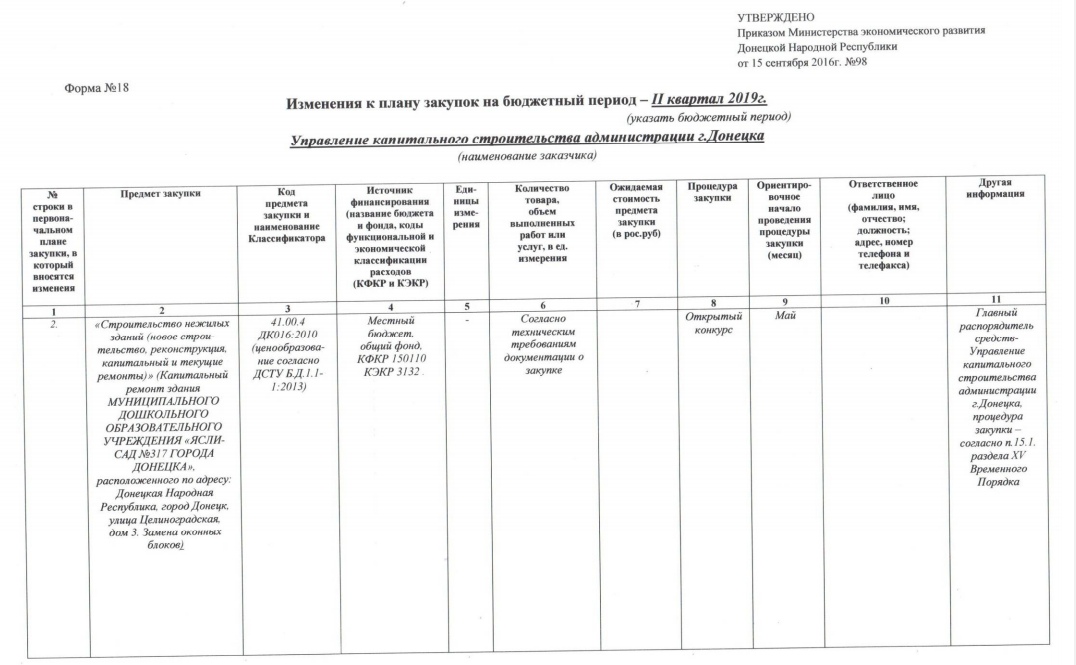 ИЗМЕНЕНИЯ К ПЛАНУ ЗАКУПОК НА БЮДЖЕТНЫЙ ПЕРИОД 2 КВАРТАЛ 2019 ГОДА Управление капитального строительства администрации г. Донецка Категория: Тендеры и закупки 07.05.2019 16:11
