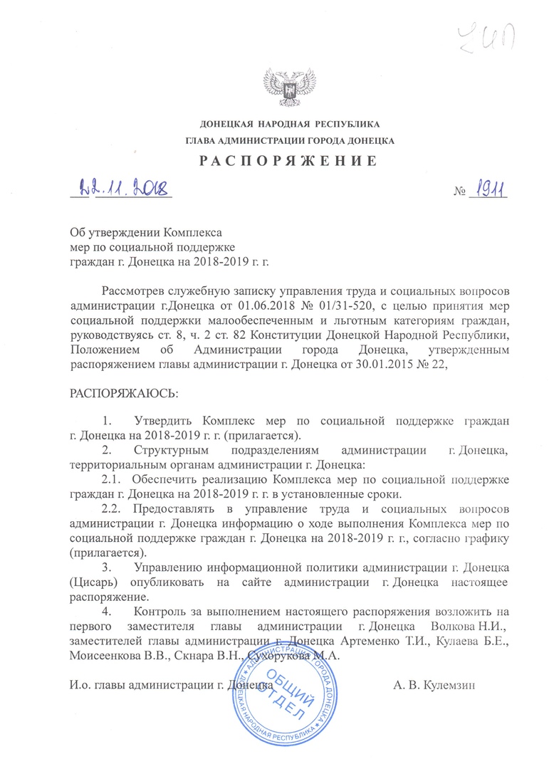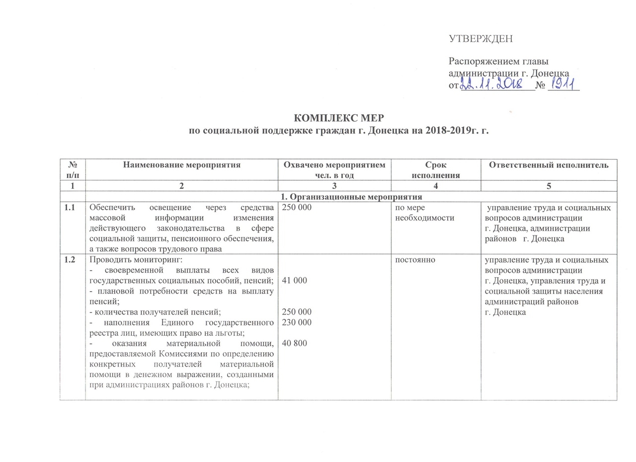 Распоряжение главы администрации г. Донецка от 22.11.2018 № 1911 "Об утверждении Комплекса мер по социальной поддержке граждан г. Донецка на 2018-2019 г.г." Категория: Распоряжение главы администрации