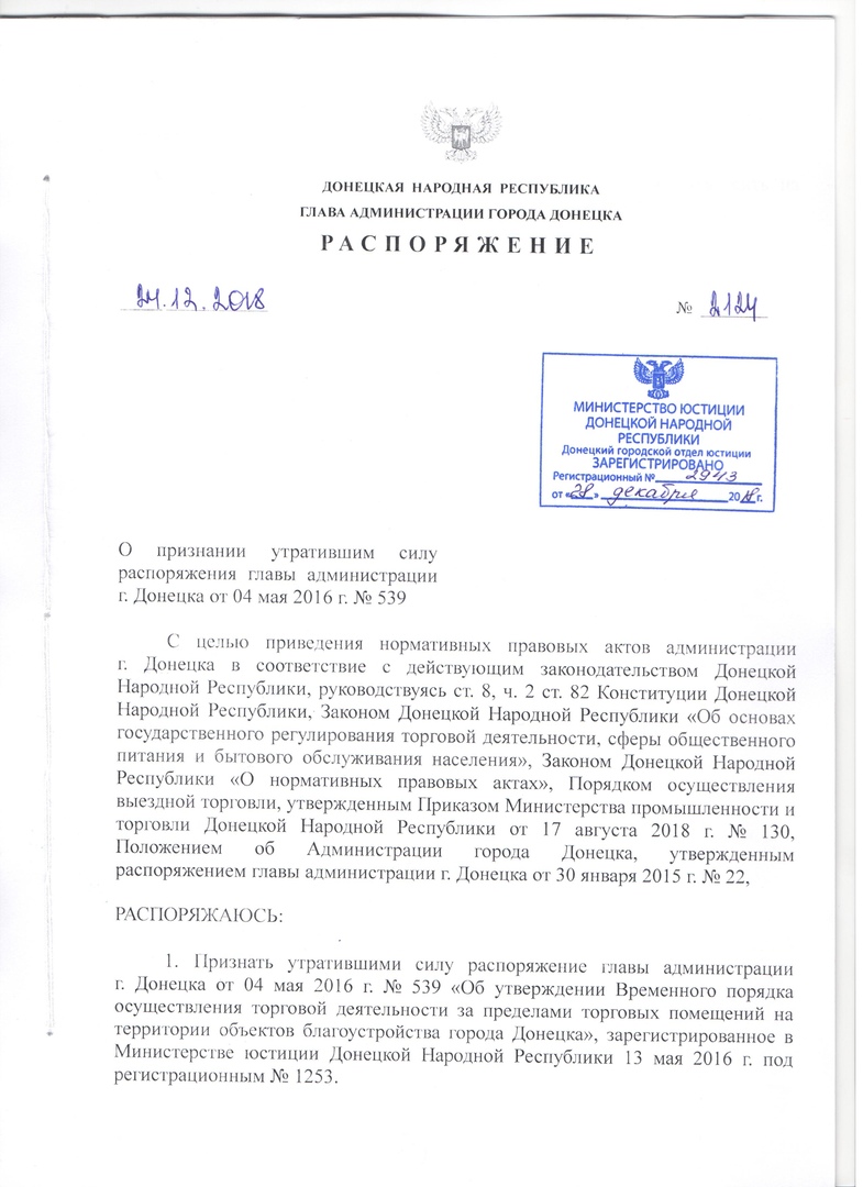Распоряжение главы администрации г. Донецка от 24.12.2018 № 2124 "О признании утратившим силу распоряжения главы администрации г. Донецка от 04 мая 2016 г. № 539" Категория: Распоряжение главы администрации