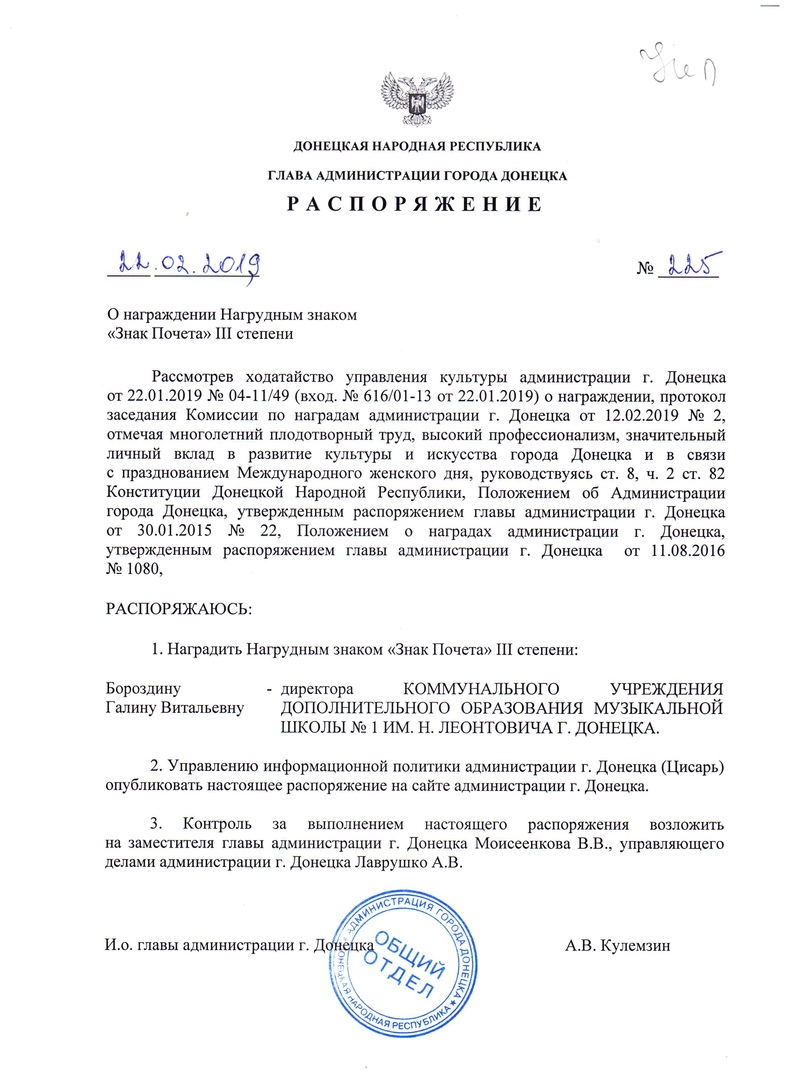 Распоряжение главы администрации г. Донецка от 22.02.2019 № 225 "О награждении Нагрудным знаком "Знак Почета" III степени" Категория: Распоряжение главы администрации