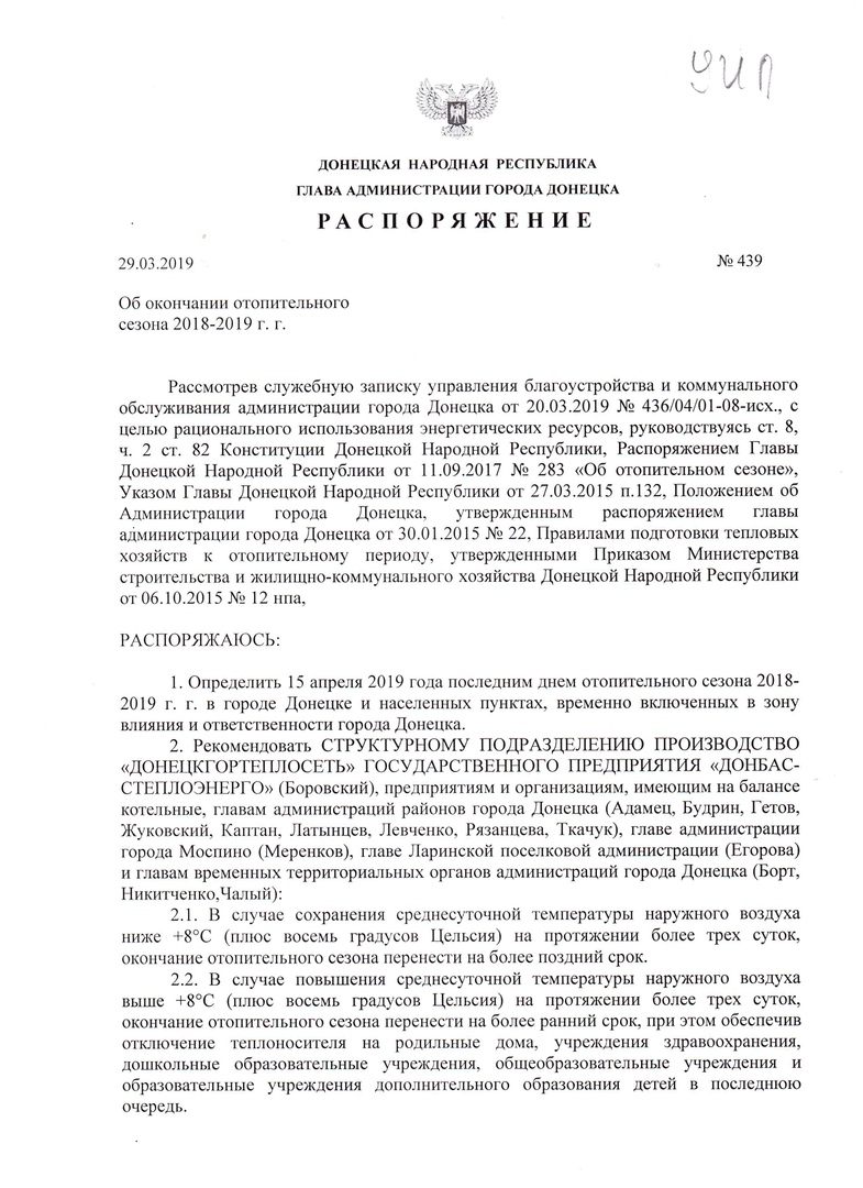 Распоряжение главы администрации г. Донецка от 29.03.2019 № 439 "Об окончании отопительного сезона 2018-2019 г. г. Категория: Распоряжение главы администрации
