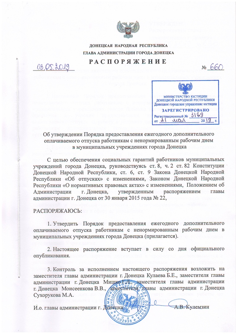 Распоряжение главы администрации г. Донецка от 03.05.2019 № 660 "Об утверждении Порядка предоставления ежегодного дополнительного оплачиваемого отпуска работникам с ненормированным рабочим днем в муниципальных учреждениях города Донецка"