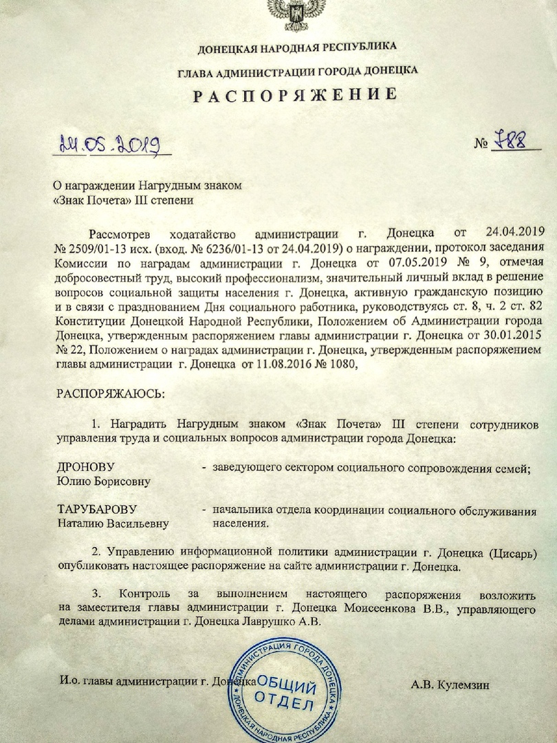 Распоряжение главы администрации г. Донецка от 24.05.2019 № 788 "О награждении Нагрудным знаком "Знак Почета" III степени" Категория: Распоряжение главы администрации