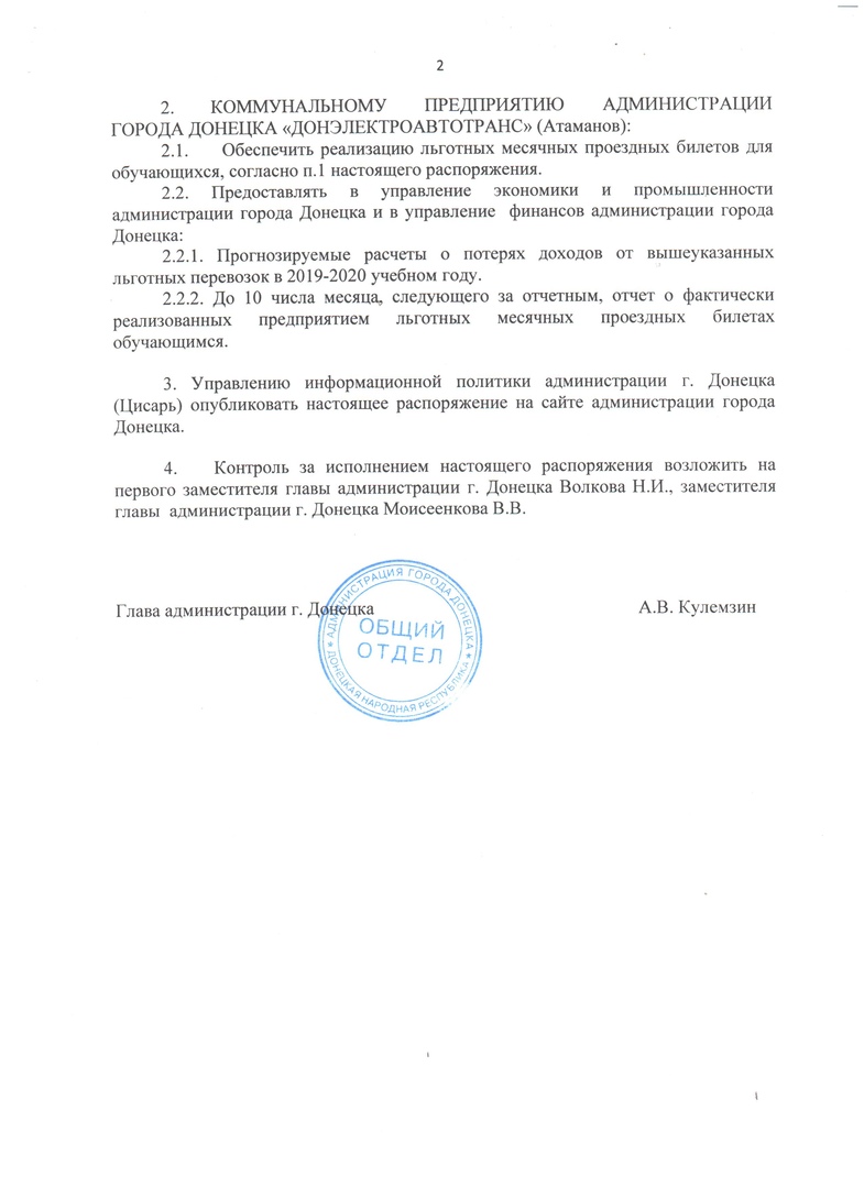 Распоряжение главы администрации г. Донецка от 10.07.2019 №1075 "О предоставлении льгот проезду в городском пассажирском транспорте обучающимся на 2019-2020 учебный год" Категория: Распоряжение главы администрации