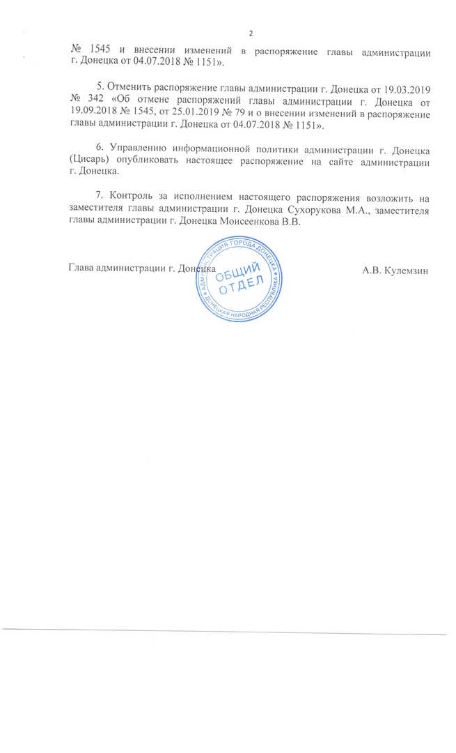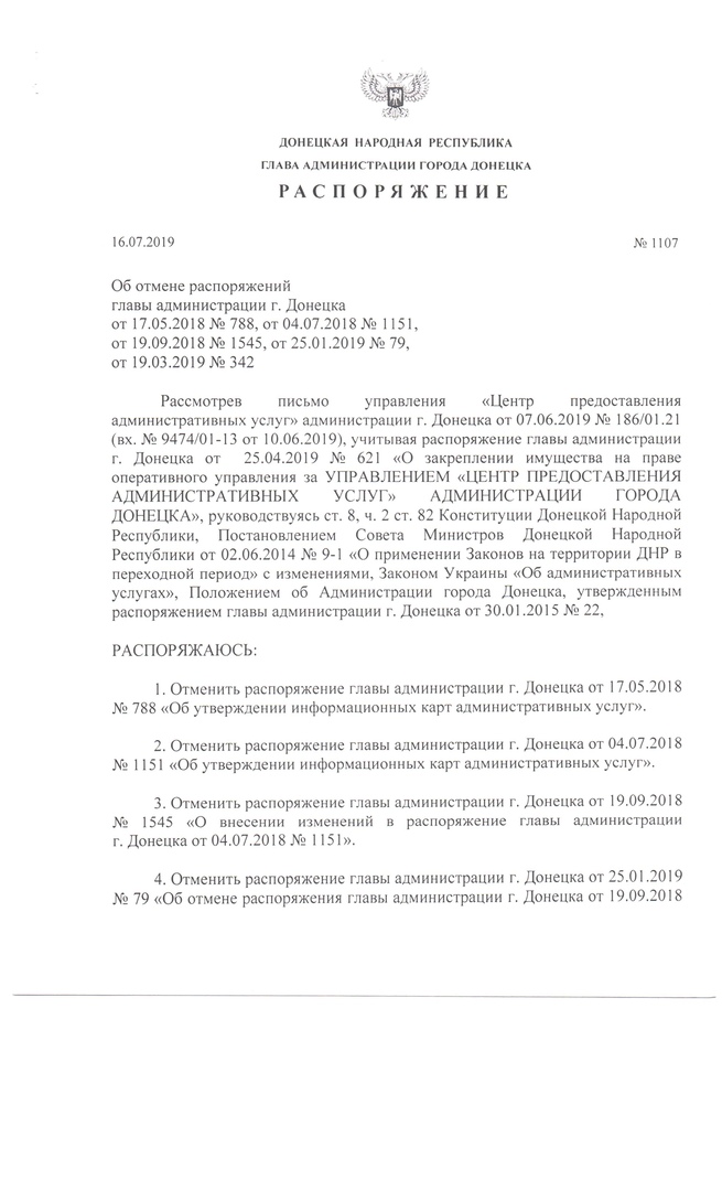 Распоряжение главы администрации г. Донецка от 16.07.2019 №1107 "Об отмене распоряжений главы администрации г. Донецка от 17.05.2018 № 788, от 04.07.2018 № 1151, от 19.09.2018 № 1545, от 25.01.2019 № 79, от 19.03.2019 № 342"