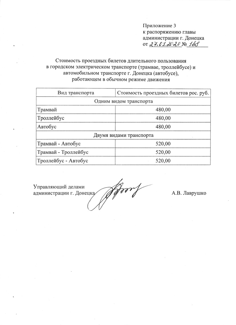 Распоряжение главы администрации г. Донецка от 27.01.2020 № 188 "О тарифах на проезд пассажиров и провоз багажа в городском электрическом и автомобильном транспорте г. Донецка, работающем в обычном режиме движения"