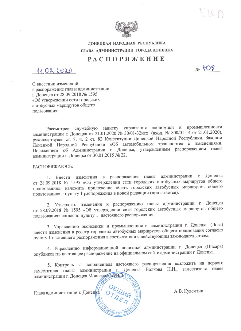 Распоряжение главы администрации г. Донецка от 11.02.2020 №308 "О внесении изменений в распоряжение главы администрации г. Донецка от 28.09.2018 № 1595" Категория: Распоряжение главы администрации